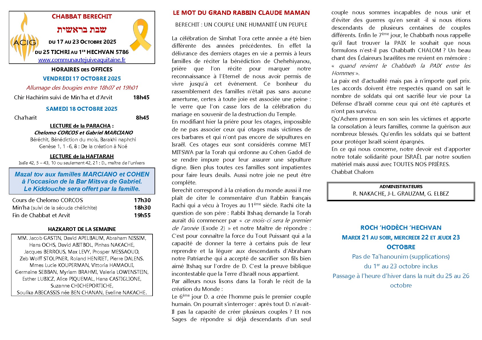PARACHA DE LA SEMAINE CHABBAT BERECHIT שבת בראשית DU 17 AU 23 OCTOBRE 2025 - DU 25 TICHRI AU 1ER HECHVAN 5786