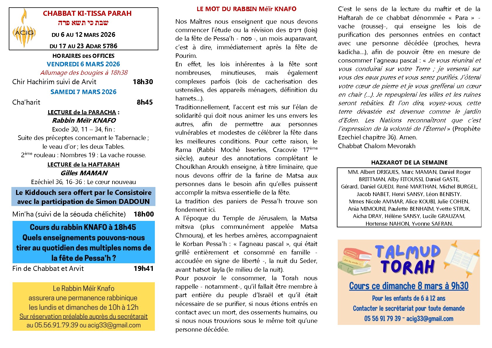 PARACHA DE LA SEMAINE CHABBAT KI-TISSA PARAH שבת כי תשא פרה DU 6 AU 12 MARS 2026 DU 17 AU 23 ADAR 5786